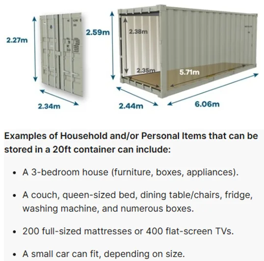 - 20ft containers (holding furniture, boxes, appliances etc), providing air tight storage for your personal belongings